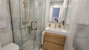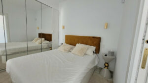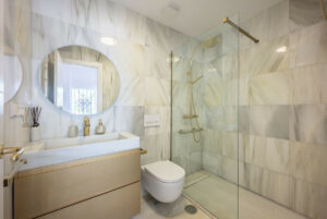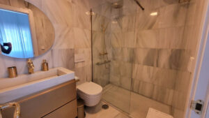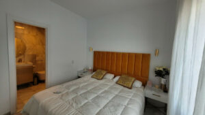 La propiedad dispone de dos dormitorios luminosos y dos baños completamente renovados en mármol, con duchas de cristal y grifería en acabado dorado que evocan el ambiente de un hotel boutique. Los suelos de mármol y la cuidada decoración aportan elegancia y sofisticación a cada estancia.