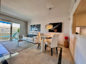 Ubicación privilegiada: este apartamento se encuentra en el prestigioso edificio Marina Banús, a menos de dos minutos a pie del puerto de Puerto Banús y de la playa. Este luminoso apartamento de dos dormitorios y dos baños goza de una ubicación privilegiada en una planta alta del edificio, lo que garantiza una excelente recepción de sol por la tarde y vistas a la piscina y a los edificios que rodean Puerto Banús. La vivienda cuenta con suelos de mármol y una amplia terraza ideal para disfrutar del clima andaluz. A diferencia de muchas propiedades en la zona del puerto, este apartamento ofrece la ventaja añadida de disponer de una plaza de garaje privada