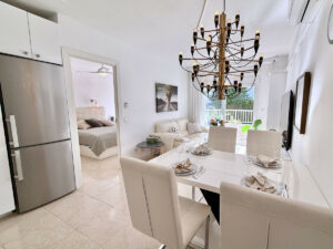 La vivienda se encuentra en la primera planta de una comunidad cerrada y segura, con orientación sur y vistas a los cuidados jardines comunitarios y a la piscina, abierta durante todo el año. La distribución de planta abierta integra la cocina moderna con la zona de comedor y el salón, creando un espacio acogedor e ideal tanto para el día a día como para vacaciones.