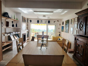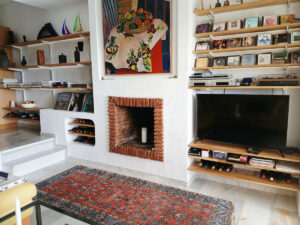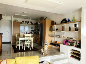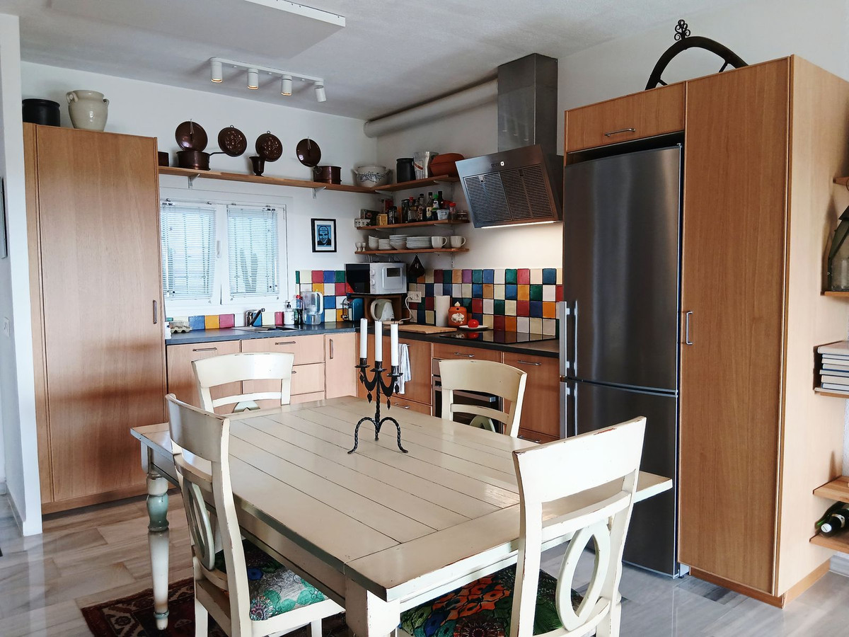 La zona principal de estar, de unos 30 m², ofrece un salón-comedor luminoso con cocina abierta de madera maciza, creando un ambiente cálido y acogedor. Todo el conjunto se realza con una elegante chimenea, iluminación LED para una atmósfera suave y un diseño a medio nivel que aporta carácter y encanto al espacio.