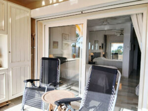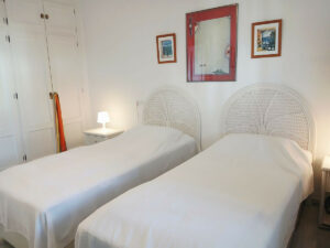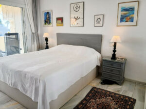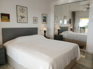 El apartamento cuenta con dos amplios dormitorios, ambos con armarios empotrados y ventiladores de techo. El dormitorio principal, con baño en suite, se abre a su propia terraza con espacio de almacenamiento y una vista al mar totalmente despejada.