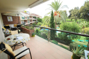 La terraza, orientada al sur, ofrece preciosas vistas abiertas al cuidado jardín, la piscina y el campo de golf de Miraflores.