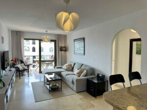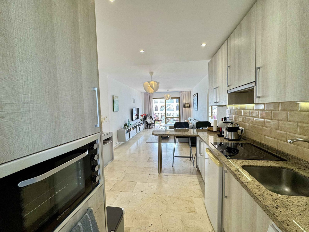 El apartamento está muy bien cuidado; cuenta con una cocina americana totalmente equipada, aire acondicionado en el dormitorio principal y se vende completamente amueblado.