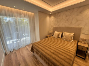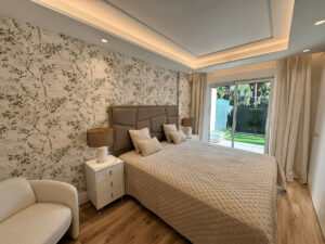 Apartamento totalmente reformado en la urbanización Las Petunias del Mar, en segunda línea de playa, a un paso del famoso Paseo Marítimo de San Pedro, con sus restaurantes y chiringuitos. Este apartamento en planta baja consta de dos dormitorios, dos baños, salón-comedor con cocina americana y jardín privado. 92 m² interiores y 41 m² exteriores. Reformado con acabados de alta calidad, el promotor ha renovado y mejorado todas las instalaciones, incluyendo fontanería, electricidad, aire acondicionado y ventanas con contraventanas eléctricas. Se vende completamente amueblado y decorado, listo para entrar a vivir.