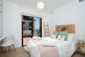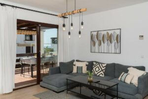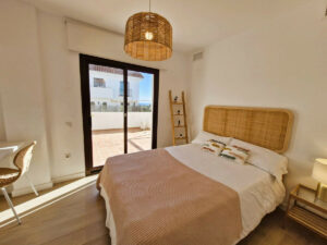 La propiedad cuenta con dos amplios dormitorios, dos baños modernos, una cocina semiabierta con electrodomésticos integrados y una luminosa zona de estar que se conecta con una generosa terraza. Desde ella se disfrutan vistas abiertas a la montaña y parciales al mar.