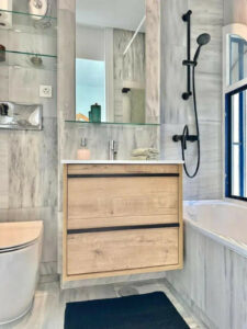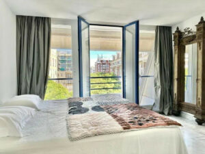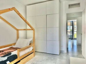 En la planta de arriba se encuentran 2 dormitorios cada uno con su baño en-suite. El dormitorio principal es espacioso, tiene una bonita vista urbana y ofrece un guiño al mar. El segundo dormitorio tiene además un balcón privado con vistas al jardín y la piscina.