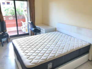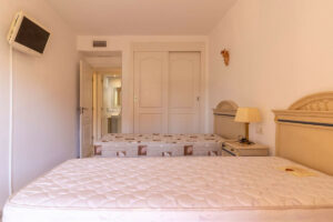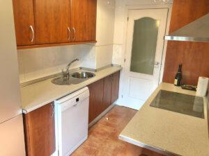 La cocina y está equipada. Además, el hall de entrada cuenta con un armario empotrado que maximiza el espacio. Pero lo que realmente destaca es la gran terraza, donde podrás relajarte mientras contemplas las vistas a la piscina y disfrutas del sol. Este piso es muy soleado, con toldos eléctricos que te permitirán regular la luz natural.