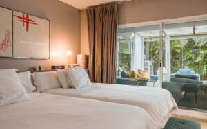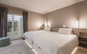 Apartamento en planta baja exquisitamente presentado, situado en una urbanización con seguridad 24 horas en Las Lomas del Marbella Club, en el corazón de la Milla de Oro. La propiedad ha sido completamente renovada y aprovecha al máximo toda su distribución de planta abierta que une la cocina, el salón y la gran terraza al aire libre, a la perfección. Los grandes ventanales del suelo al techo se abren desde el salón a un exuberante jardín tropical y a una terraza cubierta con cortinas de cristal ajustables que pueden abrirse en los meses de verano para proporcionar un increíble espacio de ocio dentro de un entorno muy privado. El apartamento aprovecha al máximo los metros cuadrados y ofrece dos amplios dormitorios, cada uno con su propio baño en suite. El dormitorio principal se abre y conecta con la gran terraza hacia la parte trasera de la vivienda. El complejo ofrece una piscina exterior con maravillosas vistas al mar, gimnasio y sauna para los residentes. La propiedad incluye 1 plaza de aparcamiento y un gran trastero. Situada en una zona muy cotizada, aproximadamente a mitad de camino entre Marbella ciudad y Puerto Banús.