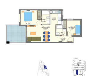 La propiedad cuenta con 2 dormitorios y 2 baños, distribuidos en un espacio moderno, funcional y lleno de luz natural.