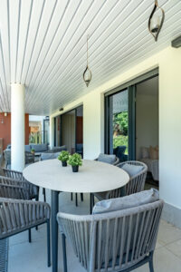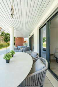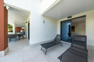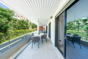 Con 100 m² interiores, dispone de 3 amplios dormitorios, 2 baños completamente reformados con acabados de alta gama y una terraza soleada de 40 m² con vistas panorámicas al campo de golf y a las montañas que lo rodean. Cada detalle ha sido cuidadosamente elegido, incluyendo una cocina de diseño equipada con electrodomésticos Bosch, placa BORA con extractor integrado y una encimera exclusiva. El salón está decorado con papel tapiz de Cavalli, aportando un toque sofisticado y lujoso al ambiente.
