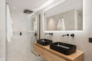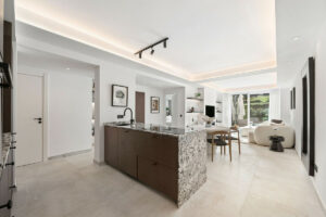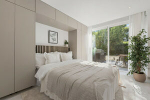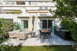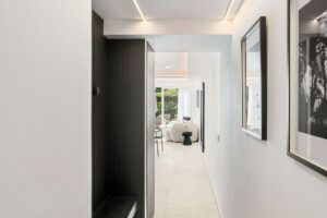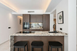 Distribuido en una sola planta, el apartamento destaca por su luminosidad natural gracias a los grandes ventanales y un diseño de planta abierta. Cada dormitorio cuenta con su propio baño, proporcionando un entorno privado y tranquilo tanto para los residentes como para los invitados. El interior presenta líneas arquitectónicas limpias, acabados cálidos en madera y una paleta de colores claros y neutros que aumentan la sensación de amplitud. La inclusión de un aseo de cortesía añade funcionalidad adicional. Su renovación completa está prevista para el año 2025 y se entregará completamente amueblado, lo que lo convierte en una opción ideal para quienes buscan comodidad inmediata y diseño moderno.