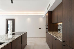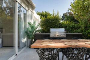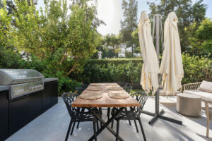 La terraza amplía el espacio habitable al exterior, creando una transición natural ideal para el ocio y el entretenimiento. Con zonas designadas para relajarse y comer, incluyendo una barbacoa integrada, esta área invita a disfrutar de comidas al aire libre con impresionantes vistas al atardecer y al entorno verde del campo de golf. La cocina, equipada con electrodomésticos Siemens, ofrece una estética minimalista con máxima funcionalidad.