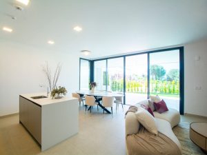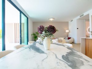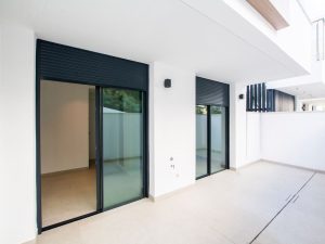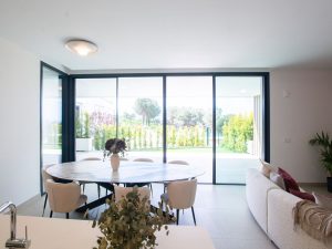 Apartamento en planta baja compuesto por tres dormitorios, dos cuartos de baño, salón con cocina abierta y terraza con jardín privado.