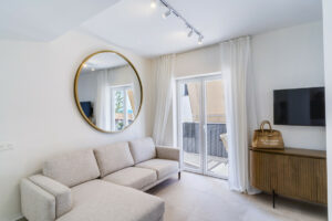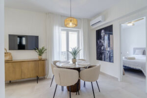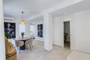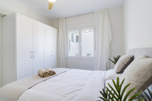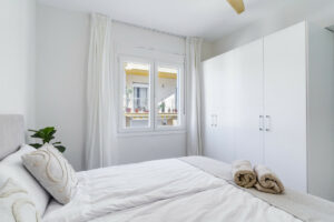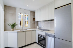 El apartamento se presenta en excelentes condiciones, ya que ha sido recientemente reformado con altos estándares de calidad y se entrega completamente amueblado, permitiendo su ocupación inmediata. La vivienda dispone de tres dormitorios, una cocina contemporánea y un cuarto de lavandería independiente. El interior cuenta con comodidades como aire acondicionado, doble acristalamiento, internet de fibra óptica y puerta blindada, garantizando confort y seguridad. Una terraza privada y un balcón ofrecen agradables espacios para disfrutar de vistas urbanas y parciales al mar, mientras que los grandes ventanales permiten la entrada de abundante luz natural.