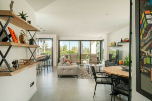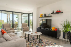 La zona de estar y comedor de planta abierta está bañada por luz natural y se extiende sin esfuerzo hacia una terraza y un jardín privados con orientación suroeste, el escenario perfecto para disfrutar del cálido clima de Estepona y las espectaculares vistas del paisaje circundante.