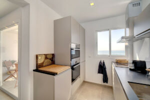 El apartamento cuenta con una luminosa zona de estar de concepto abierto, con ventanales de suelo a techo que enmarcan las impresionantes vistas al mar e inundan el espacio de luz natural. La cocina moderna se integra perfectamente en la sala de estar, creando un entorno ideal tanto para la comodidad diaria como para el entretenimiento elegante.