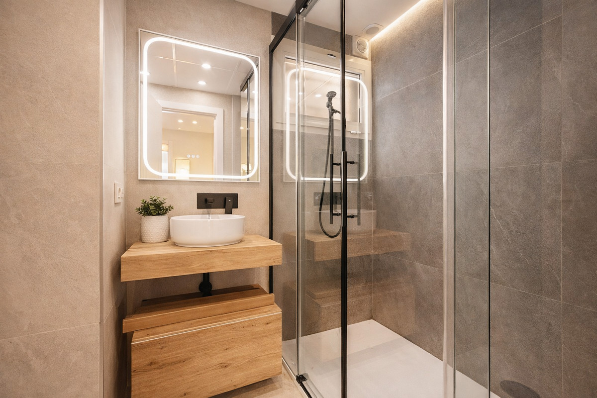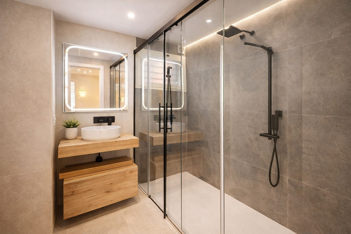 El apartamento dispone de tres amplios dormitorios, todos con armarios empotrados nuevos, forrados e iluminados, además de ventiladores de techo y un sistema de aire acondicionado de gran potencia (8.000 frigorías) que asegura el máximo confort durante todo el año. El dormitorio principal cuenta con baño en suite con ducha moderna y acceso a un balcon que da al interior de la urbanización, mientras que los otros dos dormitorios comparten un segundo baño completo. Los dos baños destacan por su renovación integral con acabados de primera, cada uno con ventanas al exterior para una perfecta ventilación. Incluyen mamparas correderas de cristal, pensadas para ofrecer mayor comodidad y elegancia.