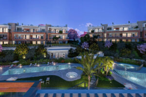 El residencial ofrece más de 6.700 m² de zonas comunes con piscinas exteriores (incluida una climatizada), jacuzzis, lago ornamental, gimnasio, zonas infantiles y amplias áreas ajardinadas
