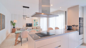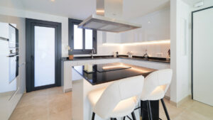 La cocina se entrega completamente equipada con electrodomésticos integrados (horno, placa, campana, frigorífico, lavavajillas, microondas y lavadora) , encimera de cuarzo y mobiliario de diseño contemporáneo.