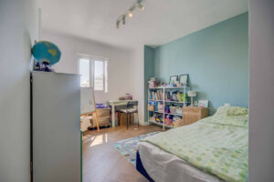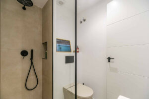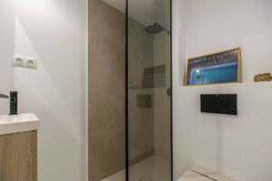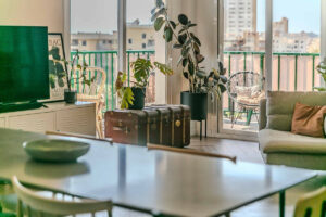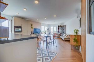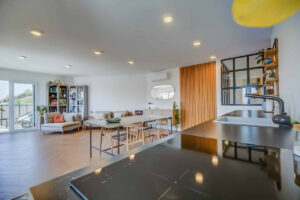 La propiedad ofrece tres dormitorios dobles, dos baños modernos y un salón-comedor con cocina integrada que se abre a la luz natural. El tercer dormitorio, acristalado y comunicado con la zona de estar, resulta ideal como despacho o como habitación de invitados, aportando versatilidad al espacio. Además, cuenta con un práctico lavadero escondido tras listones de madera, manteniendo el orden y la estética del apartamento. Cada detalle del apartamento ha sido pensado para ofrecer confort y un estilo actual, con acabados elegantes y una distribución funcional.