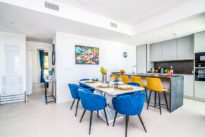 Entre sus características adicionales se incluyen aire acondicionado, doble acristalamiento, suelos de mármol, lavadero y aparcamiento subterráneo para varios vehículos. El edificio ofrece máxima comodidad y seguridad con ascensor, acceso controlado y vigilancia las 24 horas. Los residentes disfrutan de excelentes instalaciones en el complejo, como una piscina comunitaria, jardines paisajísticos, pistas de pádel y un restaurante. Su ubicación es inmejorable, a poca distancia de tiendas, la playa, transporte público, colegios y servicios esenciales.