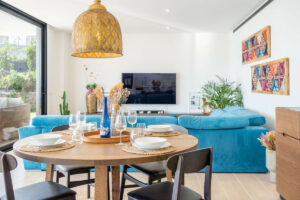 La vivienda cuenta con un amplio salón comedor muy luminoso, con grandes ventanales que se abren a una gran terraza privada, el verdadero valor añadido de esta propiedad. La cocina, totalmente equipada, dispone de isla central, perfecta para desayunos y cenas en un ambiente cómodo y funcional. Incluye horno, microondas, lavavajillas, frigorífico o cafetera.