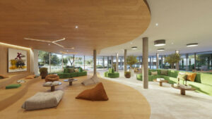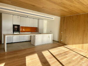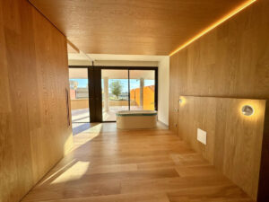 Suelo de madera combinado con detalles en madera natural en paredes y techos aportan calidez, textura y un carácter arquitectónico refinado en todo el hogar.