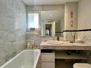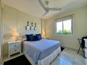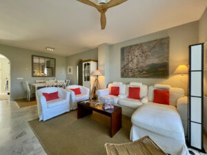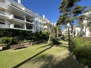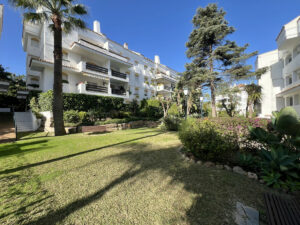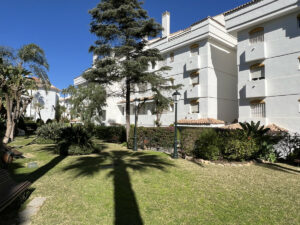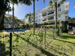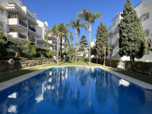 Hermoso apartamento en esquina en primera línea de golf, ubicado en un agradable complejo residencial junto a la playa en Guadalmina Baja, a solo unos pasos de la playa y de los conocidos restaurantes El Ancla, Macao y Barbillon. Este encantador y extremadamente bien conservado apartamento disfruta de hermosas vistas a la montaña de la Concha de Marbella, al Golf de Guadalmina y también vistas laterales al mar. El complejo cerrado ofrece jardines comunitarios y piscina. El vestíbulo de entrada se abre a una amplia sala de estar y comedor con chimenea, cocina totalmente equipada con lavadero. El pasillo da acceso al dormitorio principal con baño en suite, así como a otros dos dormitorios de buen tamaño que comparten un baño luminoso. Hay un aparcamiento privado subterráneo (15 m2) accesible por ascensor. Seguridad 24 horas.