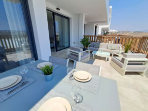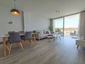 El apartamento está amueblado con mobiliario minimalista de alta calidad, en colores suaves que evocan elegancia y calma.