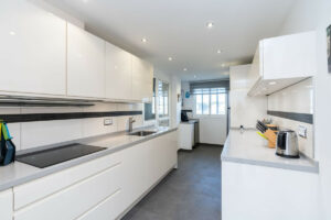 Al entrar en la vivienda, a mano izquierda se encuentra la amplia cocina con lavadero, y a la derecha, un espacioso salón con acceso directo a una terraza cubierta que ofrece unas vistas espectaculares al mar y a la montaña. Gracias a las cortinas de cristal, esta terraza se convierte en una elegante extensión del salón, perfecta para descansar y contemplar el paisaje.
