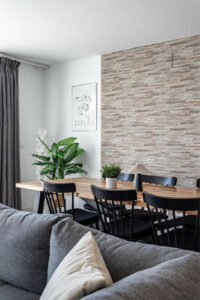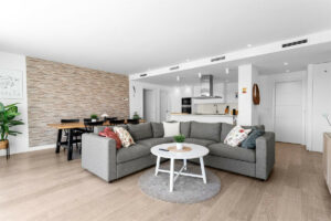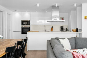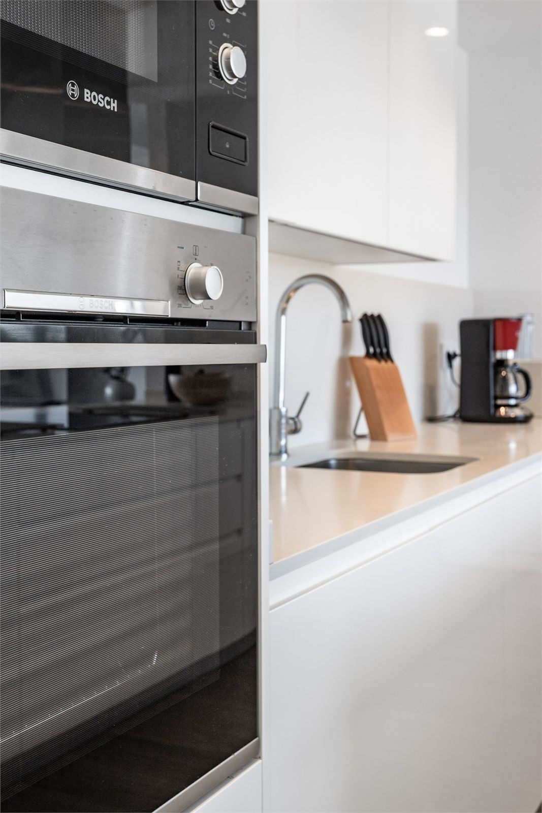 El salón es amplio y luminoso, conectado directamente con la gran cocina equipada con electrodomésticos de alta calidad de la marca BOSCH. Junto a la cocina se encuentra un práctico cuarto de servicio con lavadora y el sistema de calefacción de la vivienda. La superficie construida total es de 138 m², de los cuales 103 m² son útiles.