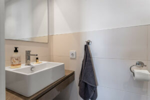 En la entrada, un recibidor acogedor con aseo de cortesía da la bienvenida. El confort adicional se consigue gracias a la calefacción por suelo radiante en toda la vivienda y a la ventilación en ambos baños.