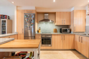 El propietario ha realizado varias mejoras, como la instalación de una sauna de infrarrojos, perfecta para la recuperación de músculos y articulaciones, y el traslado de la lavadora al baño para crear más espacio de almacenamiento y superficie de trabajo en la cocina.