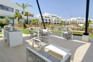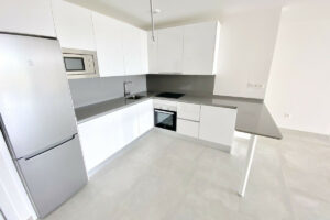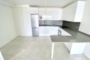 Este moderno apartamento de lujo ofrece: amplio salón-comedor con una gran cocina abierta moderna, blanca y equipada con acabados de alto brillo. Incluye horno, vitrocerámica, campana extractora, frigorífico-congelador y microondas. 3 amplios dormitorios dobles con armarios empotrados, el principal con puertas que dan a la terraza, vestidor y un lujoso baño en suite con ducha. Además, hay un segundo baño familiar con ducha. Terraza cubierta (ahora con cortinas de cristal) y jardín privado con vistas a la urbanización, con vistas a las montañas y vistas parciales al mar. Aire acondicionado frío/calor, plaza de aparcamiento privada y trastero. Los interiores presentan un hermoso diseño atemporal, con acabados de alta calidad y paletas de colores neutros.