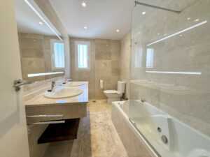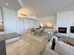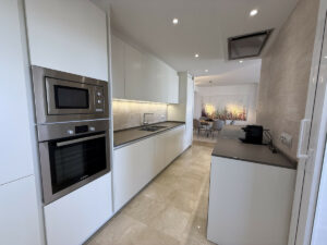 El apartamento se presenta en excelente estado y cuenta con una moderna cocina abierta, completamente equipada con electrodomésticos de alta calidad, conectada de forma fluida con las zonas de salón y comedor. Los suelos de mármol en todas las estancias añaden un toque de sofisticación, mientras que el aire acondicionado garantiza comodidad durante todo el año. La propiedad consta de tres habitaciones bien proporcionadas, incluyendo una suite principal con baño en suite, y un segundo baño familiar. Los armarios empotrados ofrecen amplio espacio de almacenamiento, y la inclusión de una puerta blindada mejora la seguridad.