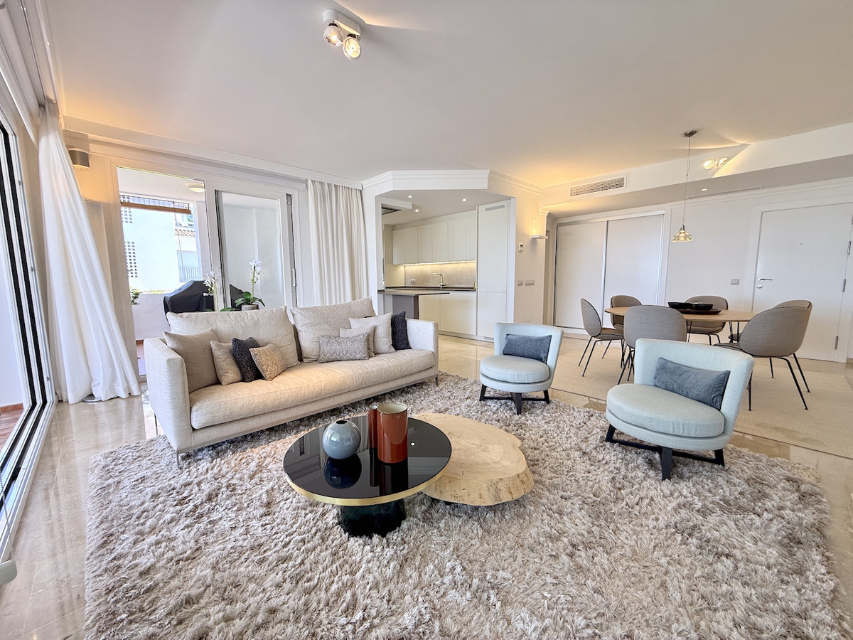 El apartamento se presenta en excelente estado y cuenta con una moderna cocina abierta, completamente equipada con electrodomésticos de alta calidad, conectada de forma fluida con las zonas de salón y comedor. Los suelos de mármol en todas las estancias añaden un toque de sofisticación, mientras que el aire acondicionado garantiza comodidad durante todo el año. La propiedad consta de tres habitaciones bien proporcionadas, incluyendo una suite principal con baño en suite, y un segundo baño familiar. Los armarios empotrados ofrecen amplio espacio de almacenamiento, y la inclusión de una puerta blindada mejora la seguridad.