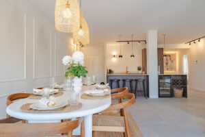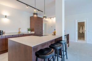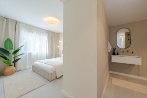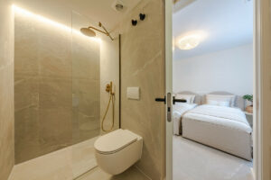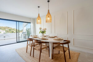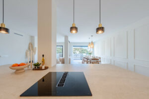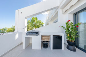 El dormitorio principal cuenta con acceso directo a la terraza y vistas al mar, mientras que ambos dormitorios de invitados disponen de baño en suite. Los acabados son de la más alta calidad, incluyendo electrodomésticos de diseño, suelos elegantes y una decoración refinada.