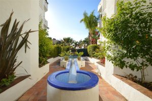 La vivienda se encuentra en una bonita urbanización de estilo mediterráneo, rodeada de jardines tropicales y coloridas buganvillas, que cuenta con dos piscinas y servicio de seguridad, ofreciendo un entorno tranquilo para disfrutar del auténtico estilo de vida marbellí.