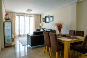 El apartamento es amplio, luminoso y lleno de luz natural, con terrazas soleadas que se abren directamente hacia el campo de golf, ofreciendo vistas despejadas al green y un ambiente sereno ideal para disfrutar del clima mediterráneo durante todo el año.