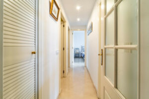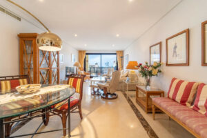 El apartamento cuenta con un luminoso salón-comedor con grandes ventanales que aportan abundante luz natural, una cocina completamente equipada y tres dormitorios de buen tamaño. El dormitorio principal dispone de baño en suite, mientras que los otros dos dormitorios comparten un elegante baño completo.