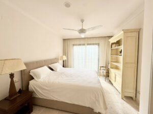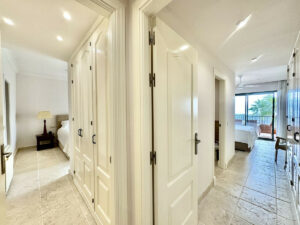A la derecha del vestíbulo, un pasillo conecta con un tercer dormitorio con baño en suite y acceso a una terraza cubierta. El dormitorio principal, ubicado al frente del pasillo, cuenta con un amplio baño en suite y acceso a una terraza privada descubierta con vistas al mar y al jardín.