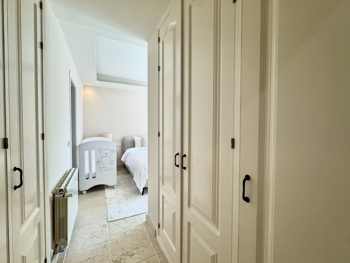 A la derecha del vestíbulo, un pasillo conecta con un tercer dormitorio con baño en suite y acceso a una terraza cubierta. El dormitorio principal, situado al inicio del pasillo, dispone de un amplio baño en suite y acceso a una terraza privada abierta con vistas al mar y al jardín.