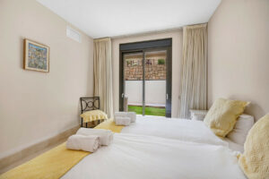 El dormitorio principal incluye un gran cuarto de baño en suite y un vestidor, con acceso directo al jardín a través de amplios ventanales. Los otros dos dormitorios están situados en la parte trasera del apartamento y comparten un cuarto de baño.