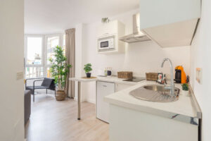 Vivienda 2: Estudio, 1 baño, cocina totalmente amueblada y equipada con electrodomésticos. Situada en 4ª planta con una superficie construida de 30 m²