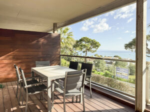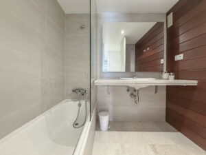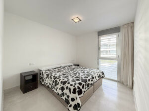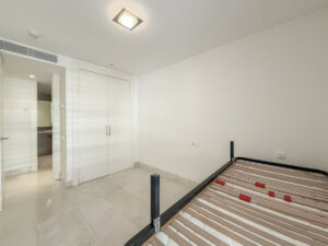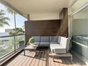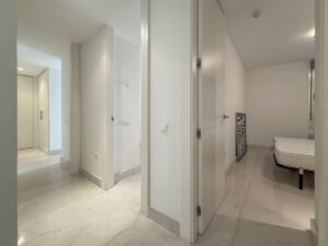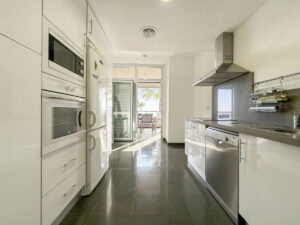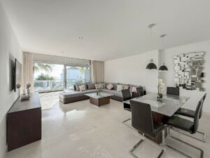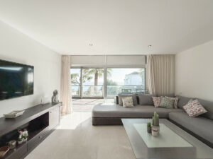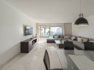 La vivienda nos recibe con un hall de entrada con armarios empotrados que da paso a un amplio y luminoso salón-comedor. Este espacio se abre a una espectacular terraza privada y cubierta, con acabados en madera premium de teca, desde donde se disfrutan impresionantes vistas panorámicas al mar.