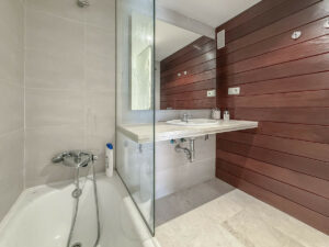 El dormitorio principal destaca por su elegancia y comodidad: vistas al jardín, vestidor a ras de suelo y baño en suite con doble lavabo y sofisticados acabados en teca y mármol.