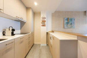 La sala de estar de planta abierta está diseñada para la comodidad y el entretenimiento, ofreciendo un acogedor espacio lounge con aire acondicionado. La cocina de estilo americano, accesible desde la sala de estar, está totalmente equipada con electrodomésticos modernos que incluyen vitrocerámica de inducción, lavavajillas, microondas con grill y lavadora.