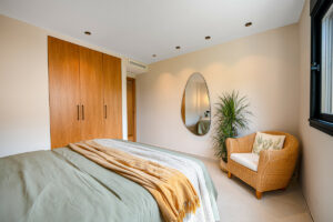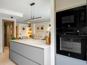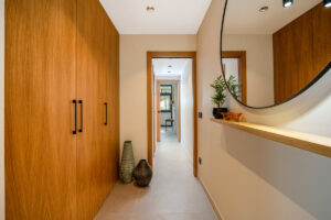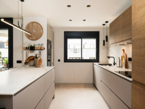 La cocina de concepto abierto se integra perfectamente con el salón y el comedor, creando un espacio amplio y acogedor. Los electrodomésticos de alta gama, el amplio espacio de almacenaje y una elegante barra de desayuno hacen que la cocina sea práctica y atractiva a la vez. Las puertas correderas dan acceso a una terraza privada, ideal para disfrutar de comidas al aire libre o relajarse al sol de la tarde. Los tonos neutros, las texturas naturales y las líneas limpias aportan una sensación de calma y sofisticación en todo el hogar.