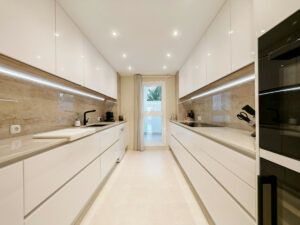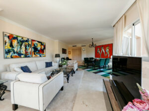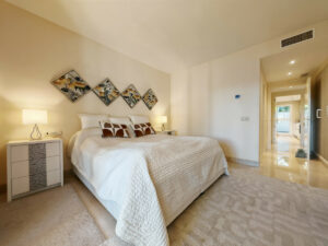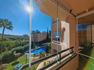 Apartamento en venta en Las Terrazas de Santa Maria Golf, Marbella con 3 dormitorios, 2 baños y con orientación sur/este, con piscina comunitaria y garaje privado (1 plazas). Respecto a las dimensiones, la propiedad presenta 142 m² construidos y 45 m² de terraza. Tiene las siguientes características servicios cercanos, transporte cercano, aire acondicionado, cocina totalmente equipada, trastero, suelos de mármol, almacén, entrada de seguridad, cristal doble, videoportero, comedor, terraza privada, cocina equipada, salón, vistas al campo, vistas al golf, lavadero, internet – wi-fi, terraza cubierta, armarios empotrados, comunidad cerrada, ascensor, vistas a la piscina, vistas panorámicas, cerca del golf, balcón, muebles opcionales, excelente estado, recientemente renovado, tiendas cerca, colegios cerca, cámaras de vigilancia y oficina.