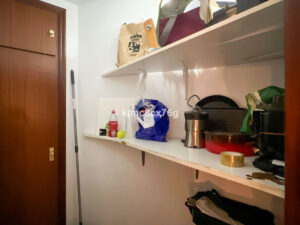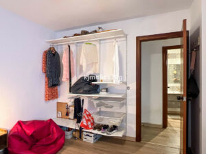Los dormitorios son cómodos y versátiles, y uno de ellos se utiliza actualmente como oficina en casa. El apartamento también dispone de soluciones de almacenaje integradas, como armarios abiertos y estanterías.